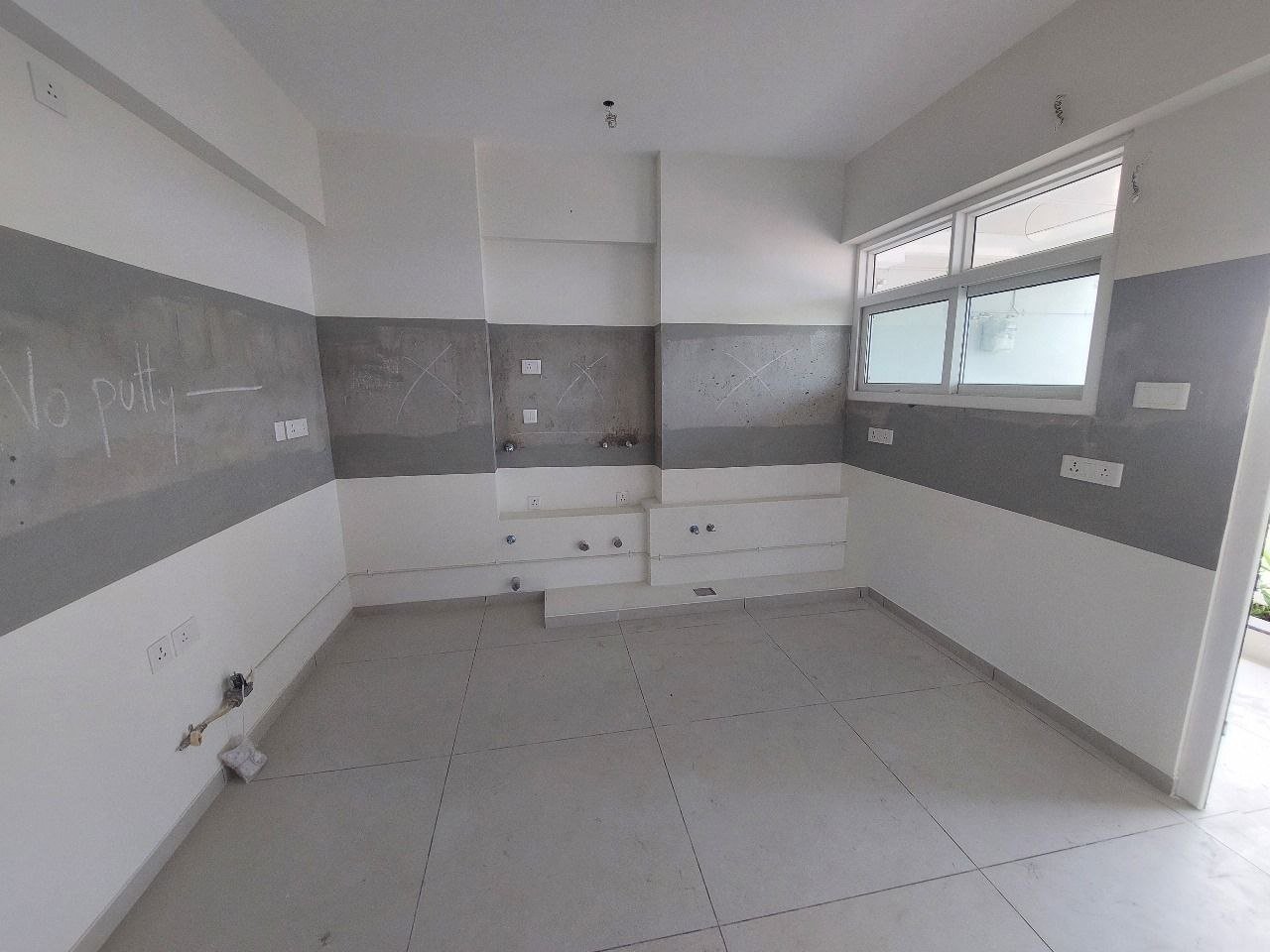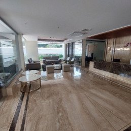 The entire apartment is adorned with expansive vitrified tiles measuring 120cm x 80cm, excluding the bathrooms, which feature ceramic tiles.